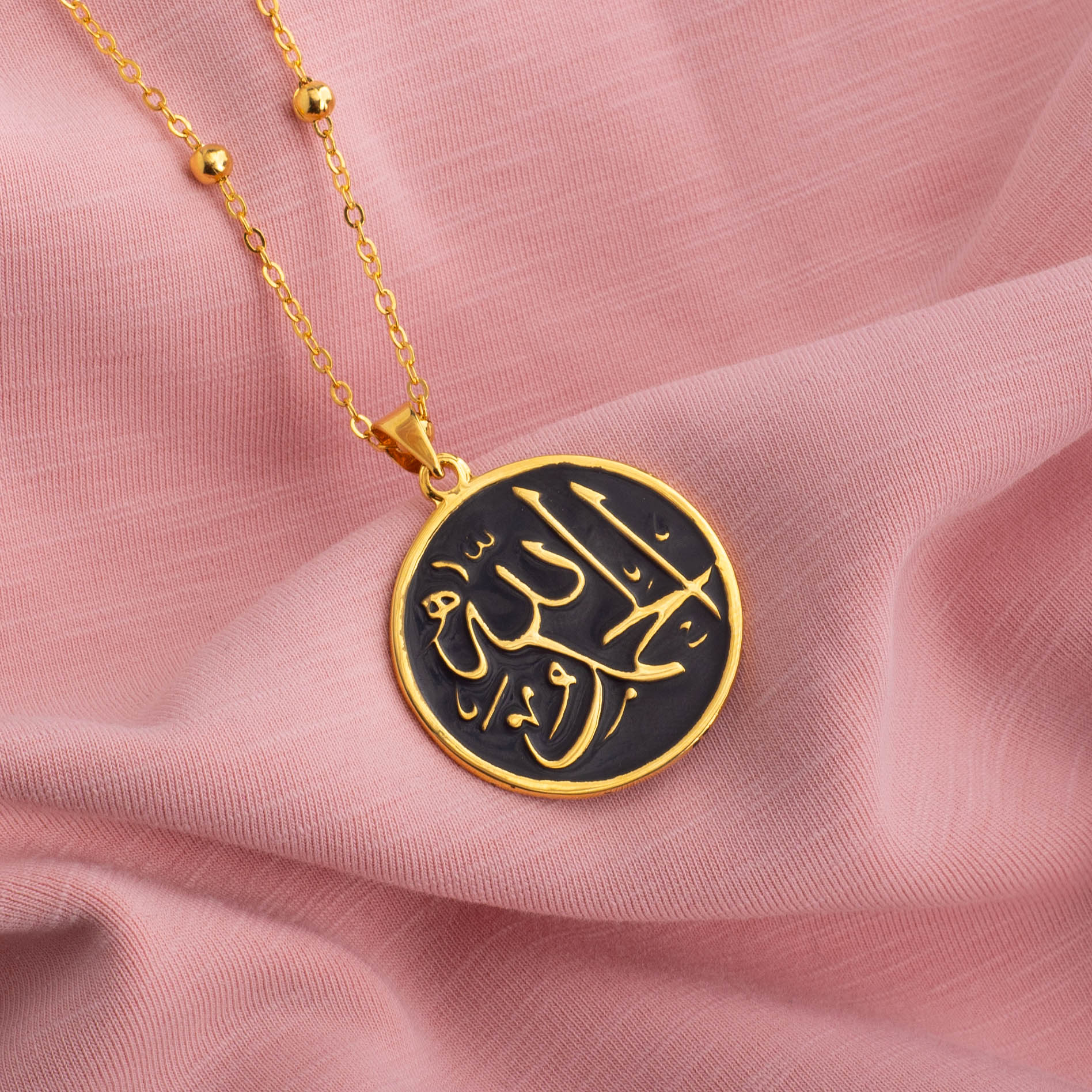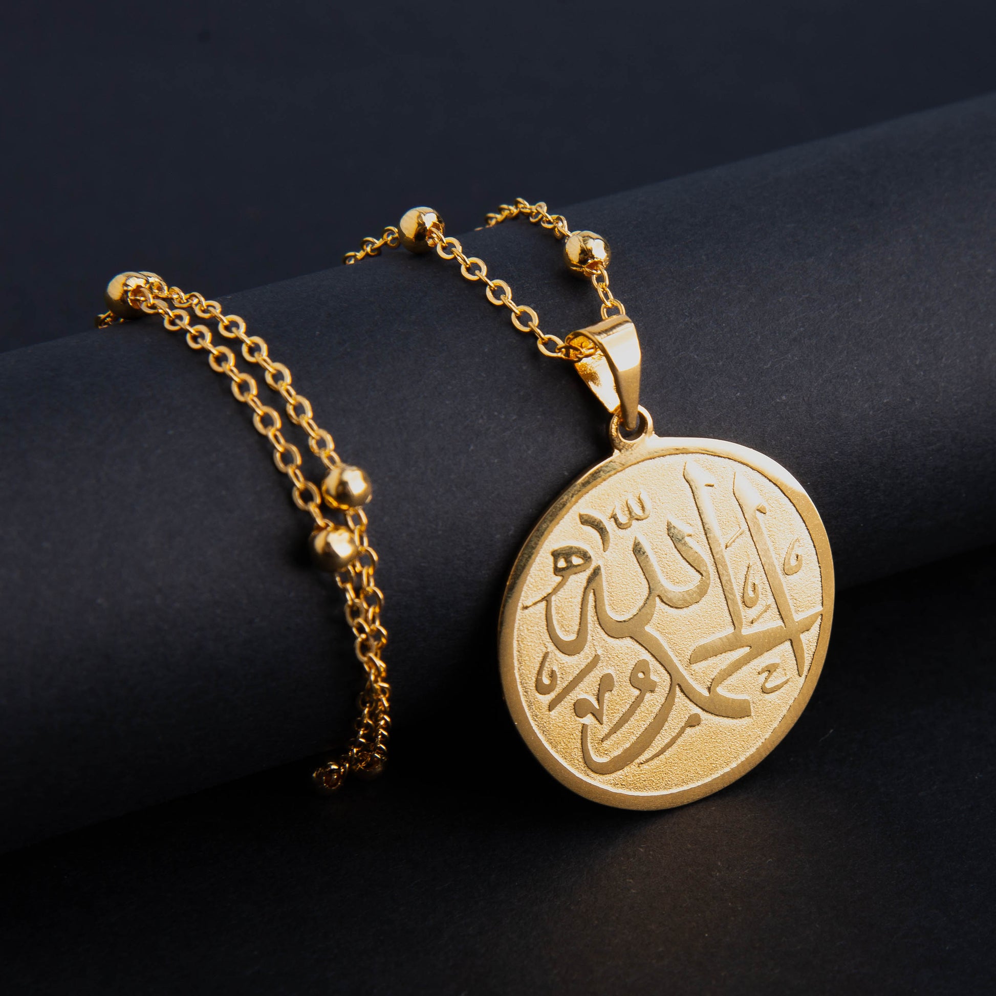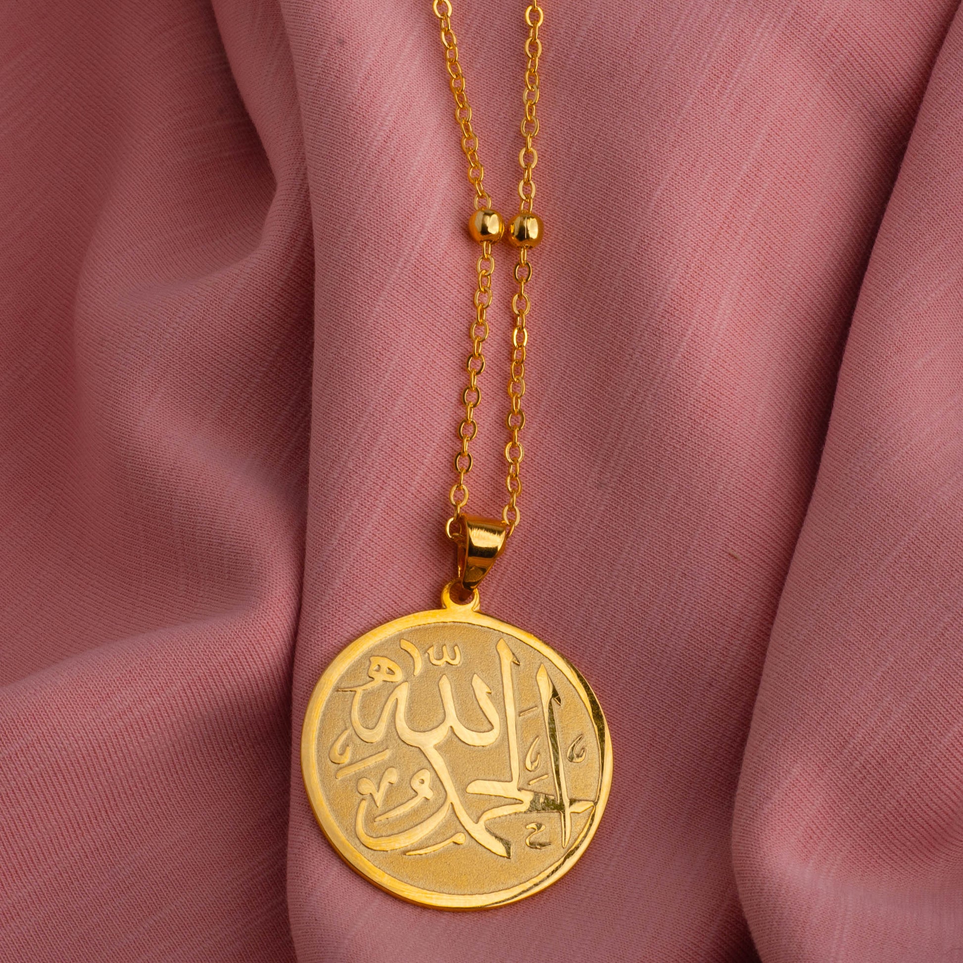 The focal point of the necklace is the intricate engraving of the word "Alhamdulillah," meaning "Praise be to God" in Arabic, across the pendant. This spiritual expression is beautifully displayed, serving as a source of inspiration and gratitude for the wearer.