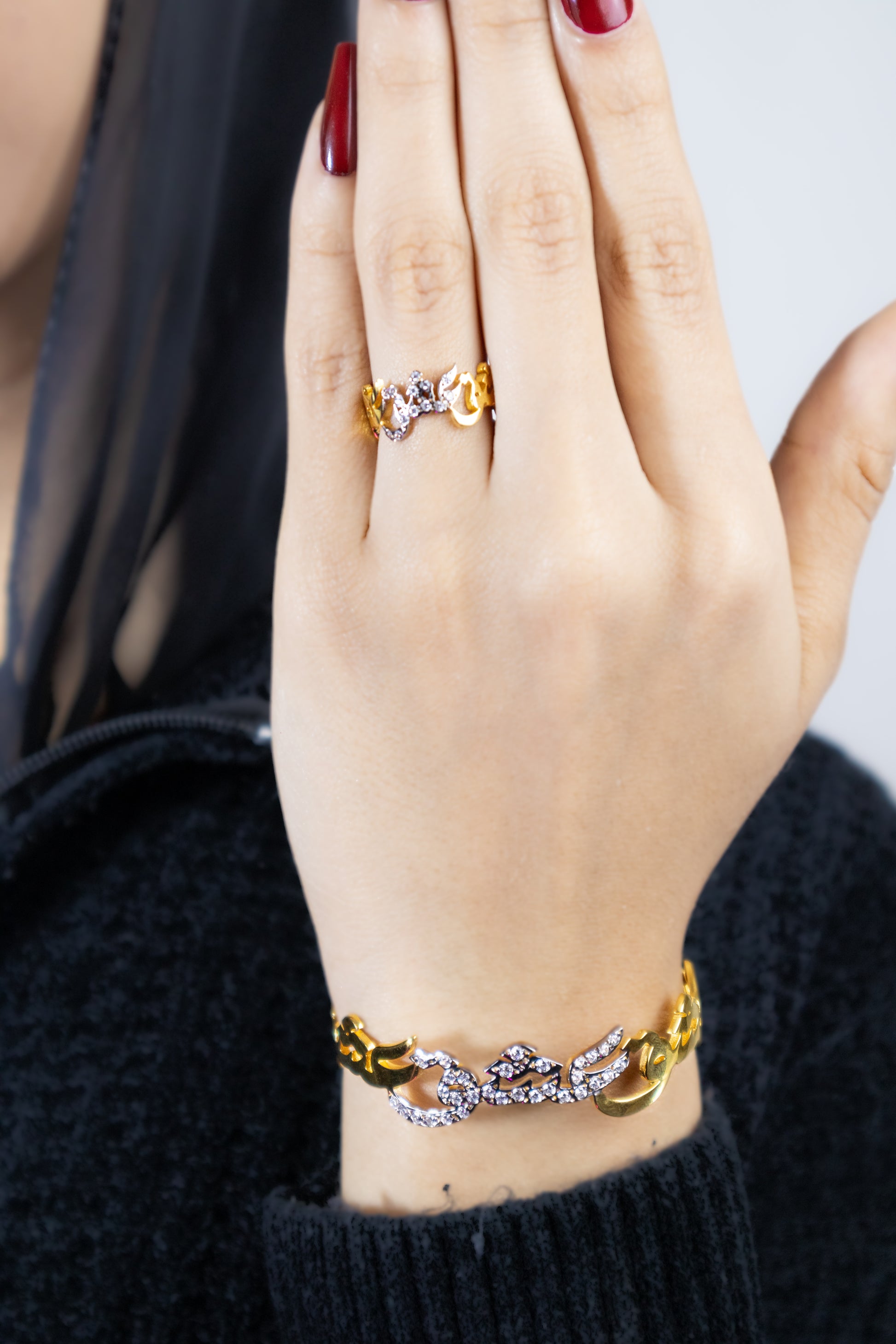 Introducing our exquisite Ishq Bracelet, beautifully designed in Arabic calligraphy to spell the word “Ishq” (عشق), meaning deep, passionate love. This elegant cuff blends timeless artistry with a modern touch, adorned with shimmering crystal accents that illuminate the flowing script.