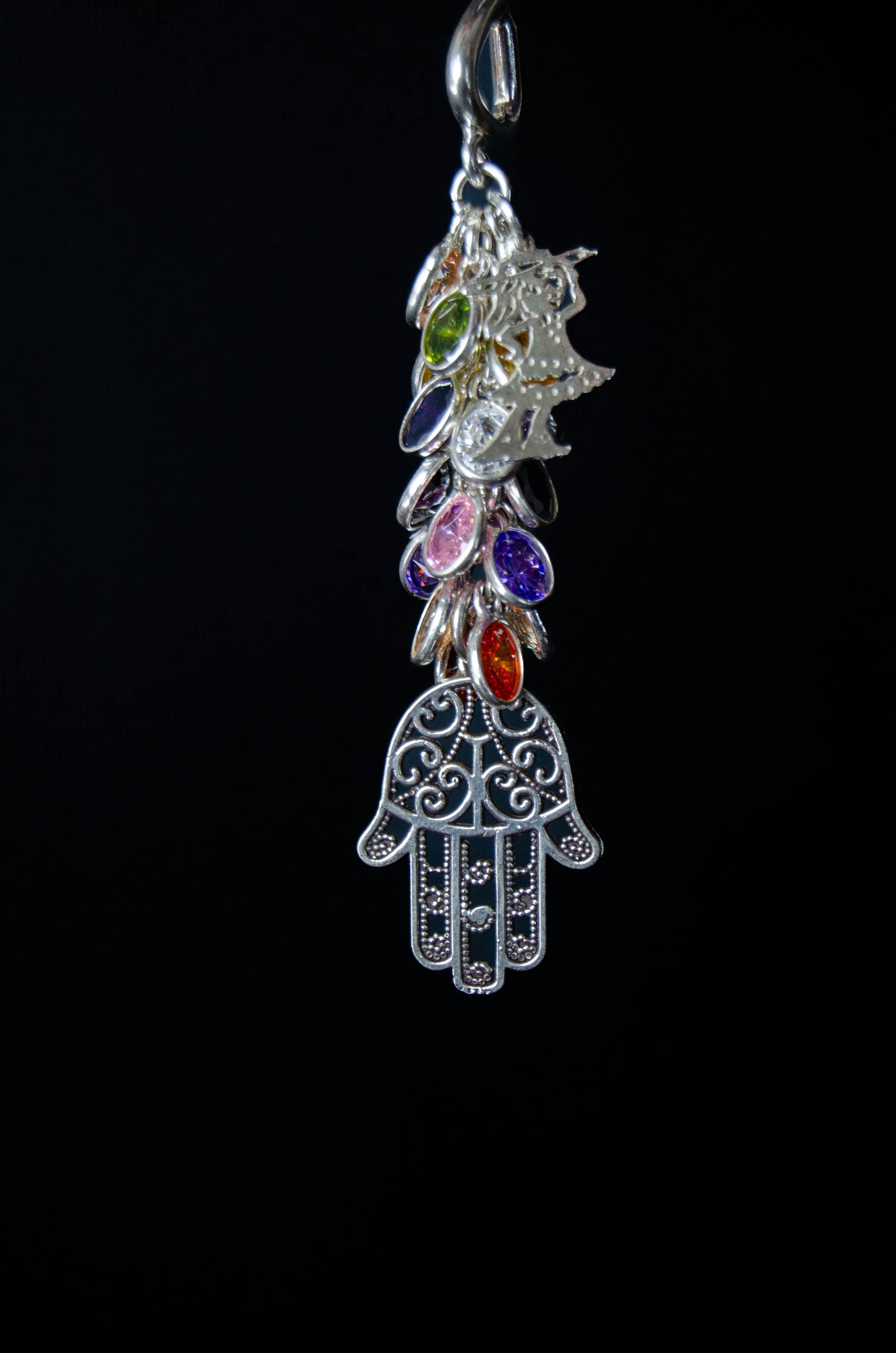 Step into a realm of enchantment and symbolism with our Pure Silver Keychain adorned with Multicolored Crystals and a Khamsa charm, a fusion of elegance, spirituality, and intricate craftsmanship. Crafted with utmost care and attention to detail, this keychain is a radiant testament to both beauty and protection.