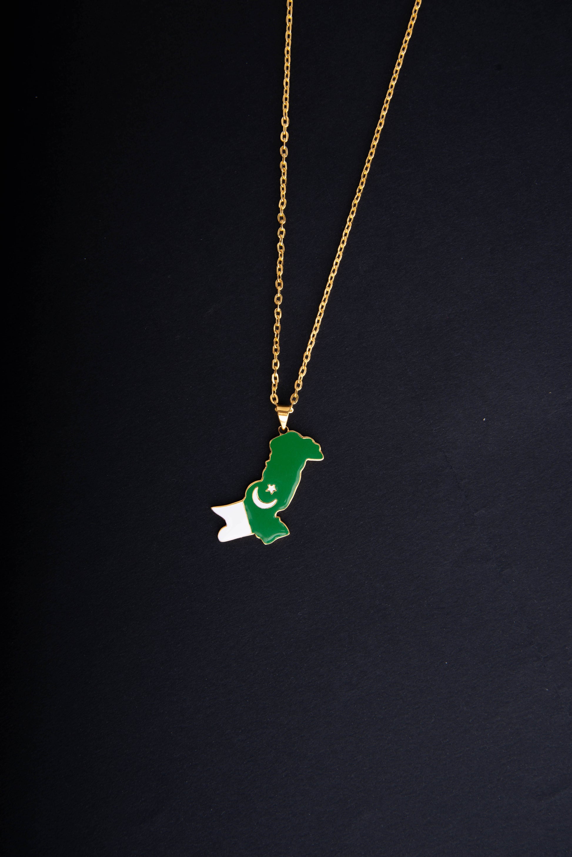The gold-plated Pakistani flag necklace is a striking and meaningful piece of jewelry that honors the heritage and national pride of Pakistan. This necklace features a pendant designed in the shape of the Pakistani flag, showcasing the flag's iconic green and white colors along with the white crescent moon and five-pointed star.