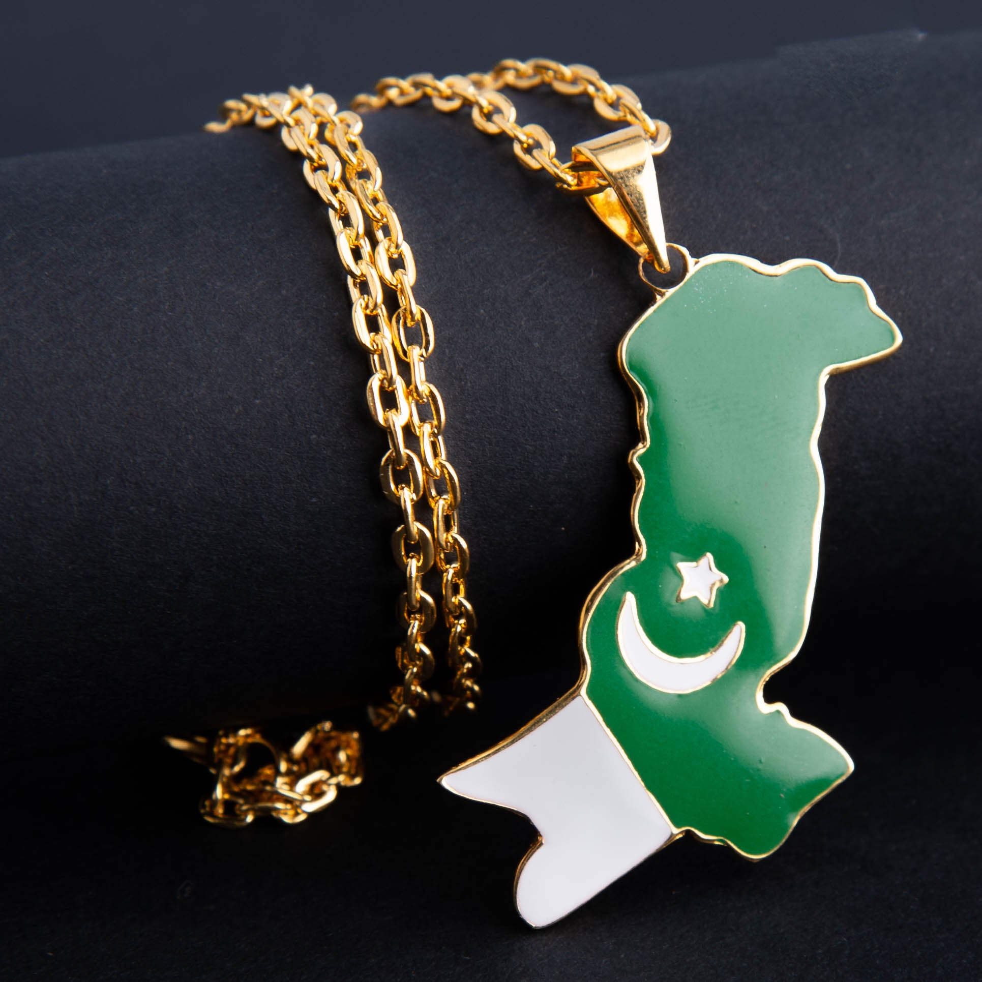 The pendant is expertly crafted and plated with gold, giving it a radiant and luxurious finish that enhances its beauty and makes it a standout accessory. The design captures the distinctive elements of the Pakistani flag, highlighting the symbolism of the crescent and star for progress and light, as well as the green and white colors representing peace and prosperity.